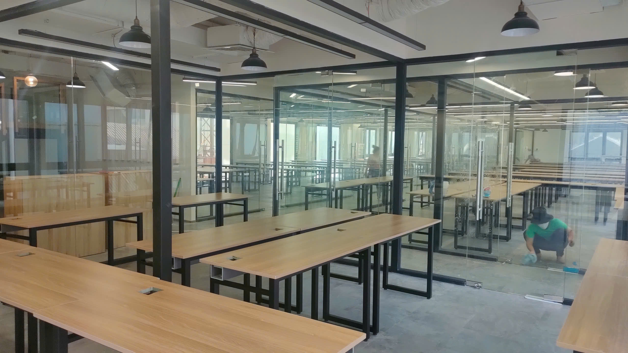 Điểm nổi bật của dự án này là không gian mở rộng thoáng, tận dụng tối đa ánh sáng tự nhiên từ hệ thống cửa kính lớn. Bàn làm việc chung được bố trí khoa học với ghế xoay hiện đại, mang lại sự thoải mái cho nhân viên trong quá trình làm việc.