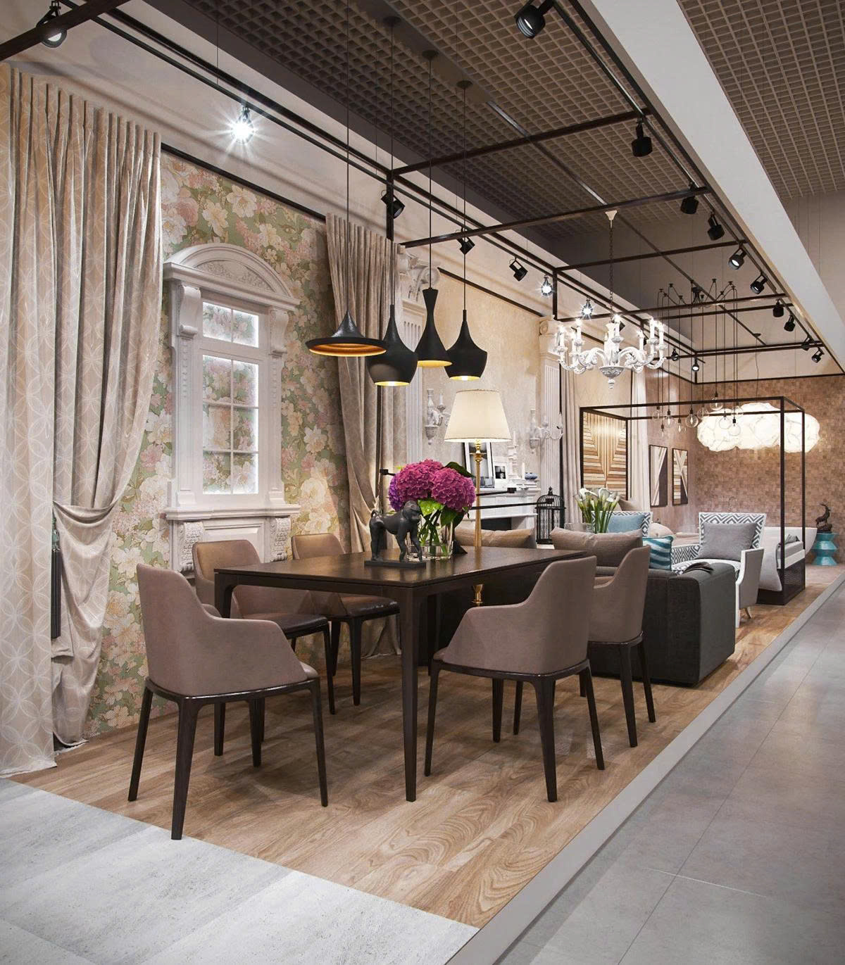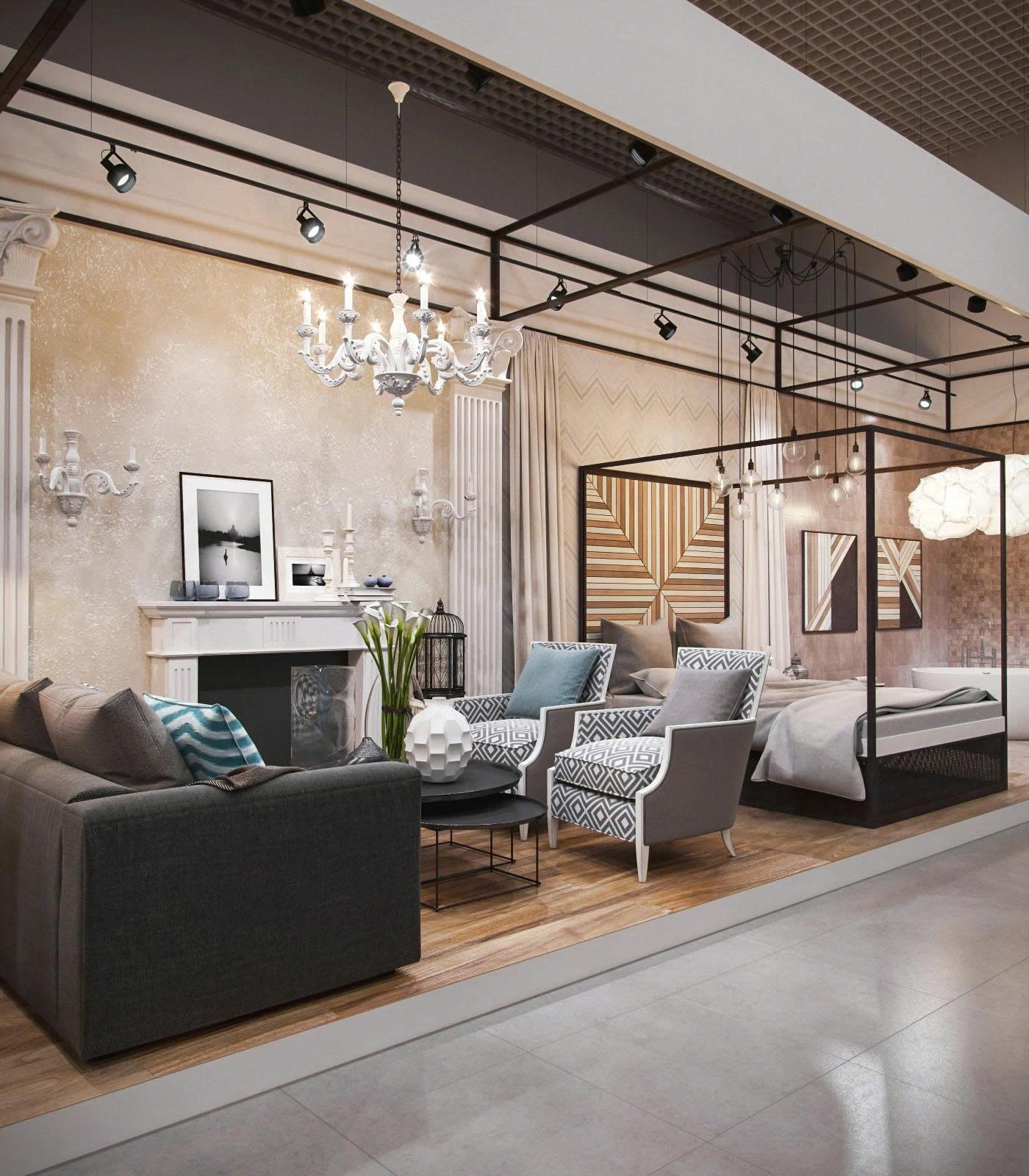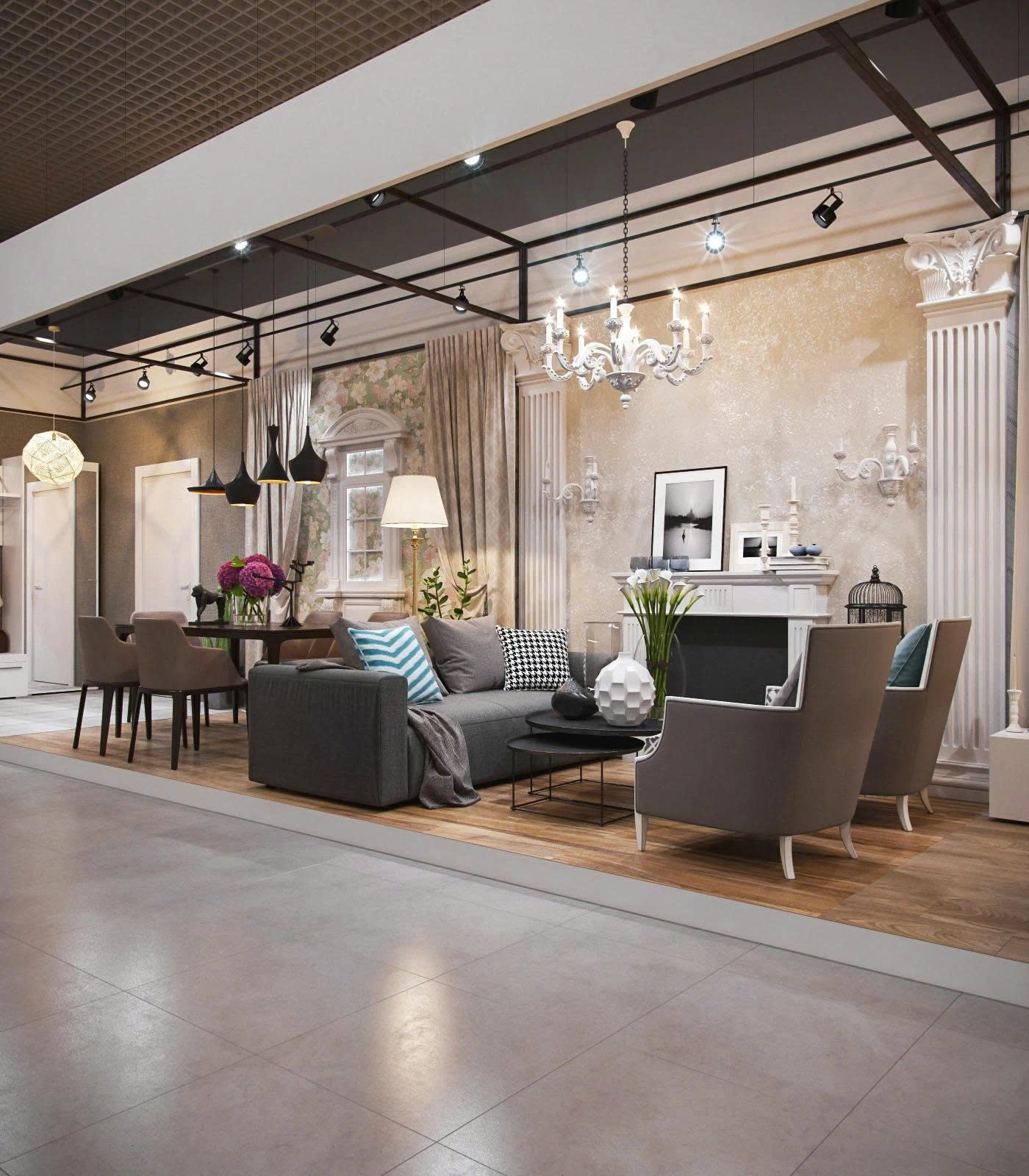 Không gian triển lãm được thiết kế sang trọng theo phong cách tân cổ điển pha lẫn hiện đại. Khu vực trưng bày gồm phòng khách mẫu với sofa, bàn trà, ghế bành và hệ thống đèn chùm tinh tế. Nội thất phối hợp hài hòa giữa gam màu trung tính và điểm nhấn hoa văn, tạo cảm giác ấm cúng nhưng vẫn đẳng cấp. Đây là hạng mục tiêu biểu nhằm giới thiệu sản phẩm và khẳng định thương hiệu nội thất cao cấp. tới các chủ đầu tư.