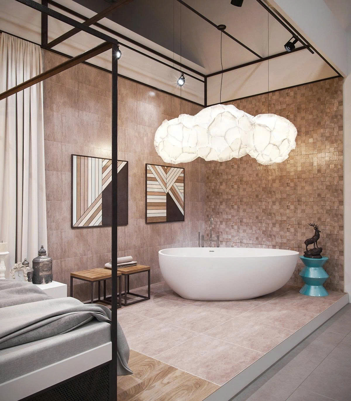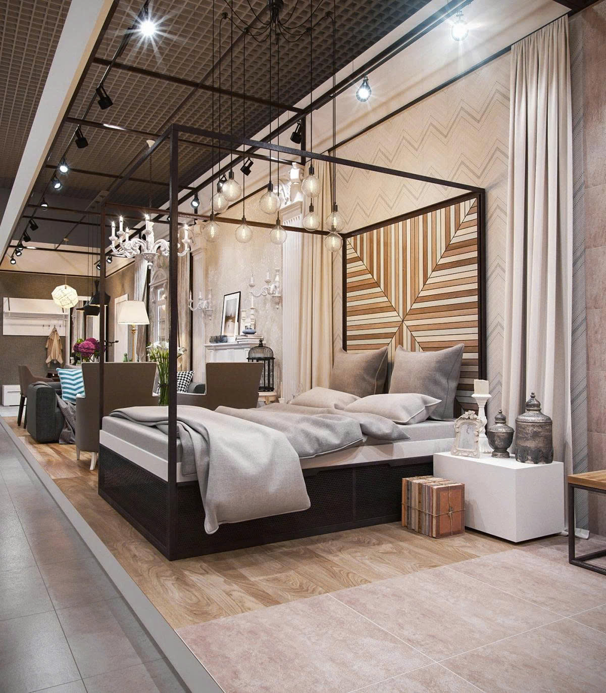 - Chất liệu và màu sắc: Gỗ nâu trầm, vải nỉ be, kim loại ánh sáng cùng hoa văn trang trí tinh xảo giúp không gian vừa hiện đại vừa cổ điển.