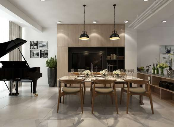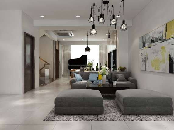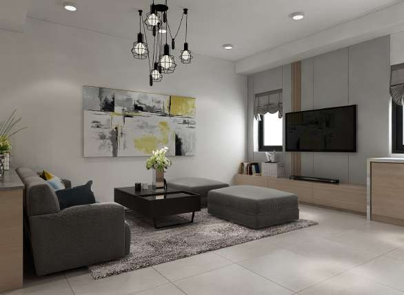 - Ứng dụng: Phòng khách – phòng bếp mở, sofa hiện đại, kệ TV âm tường.