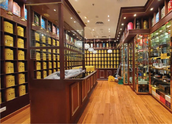 Các kệ tủ gỗ cao, đồng bộ màu sắc, kết hợp ánh sáng dịu, làm nổi bật sản phẩm được bày biện. Không gian vừa cổ điển vừa hiện đại.