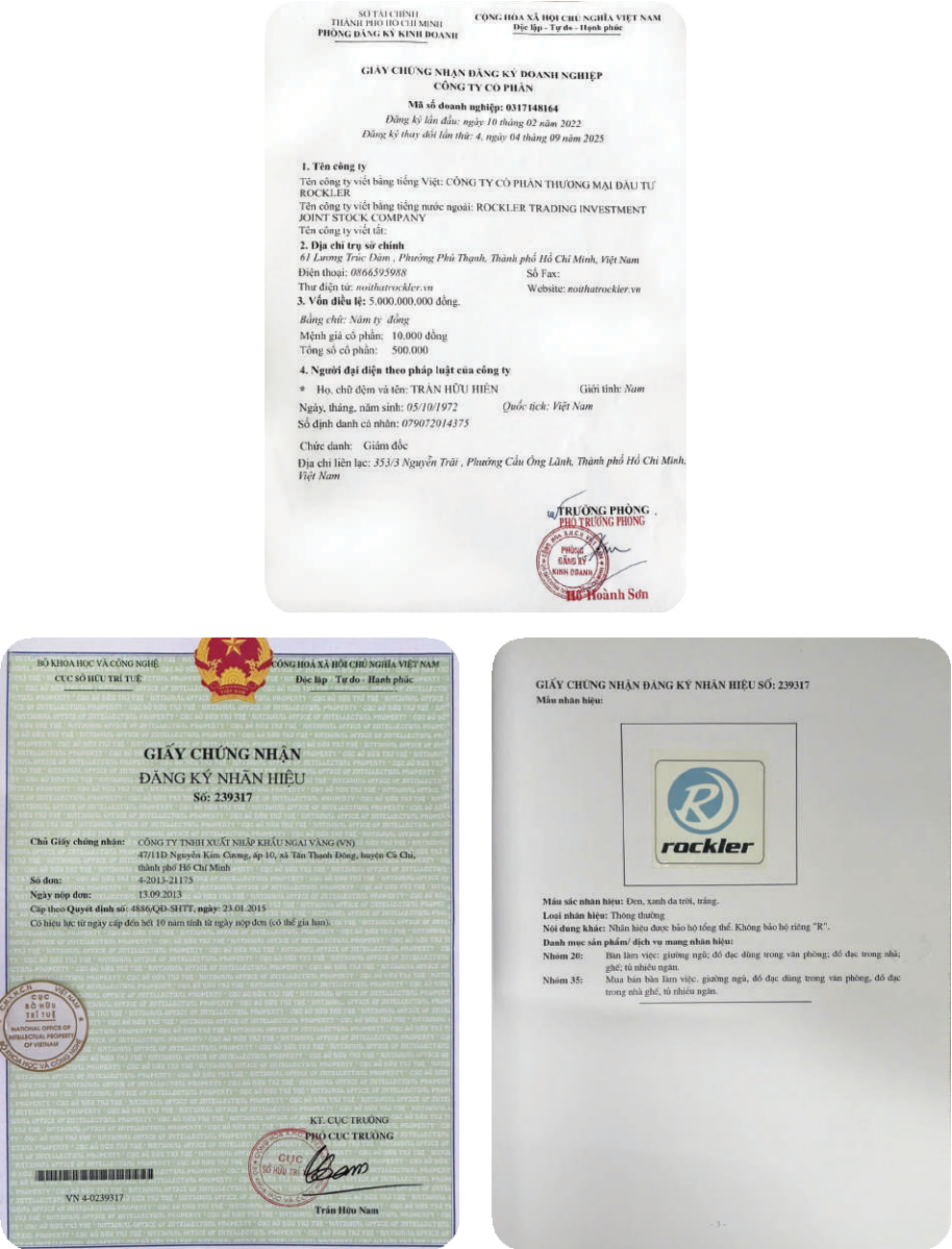 Rockler Furniture Nội Thất luôn đặt uy tín và sự minh bạch lên hàng đầu. Mọi hoạt động kinh doanh đều được thực hiện theo giấy phép đăng ký hợp pháp và tuân thủ quy định pháp luật Việt Nam. Thông tin doanh nghiệp, điều khoản hợp đồng, chế độ bảo hành và chính sách bảo mật đều được công khai rõ ràng, đảm bảo quyền lợi tối đa cho khách hàng. Chính sự minh bạch này đã giúp Rockler Furnituretrở thành đối tác tin cậy của hàng trăm khách hàng cá nhân, doanh nghiệp và showroom trên toàn quốc.